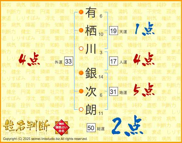 有(6画)栖(10画)川(3画) 銀(14画)次(6画)朗(11画)