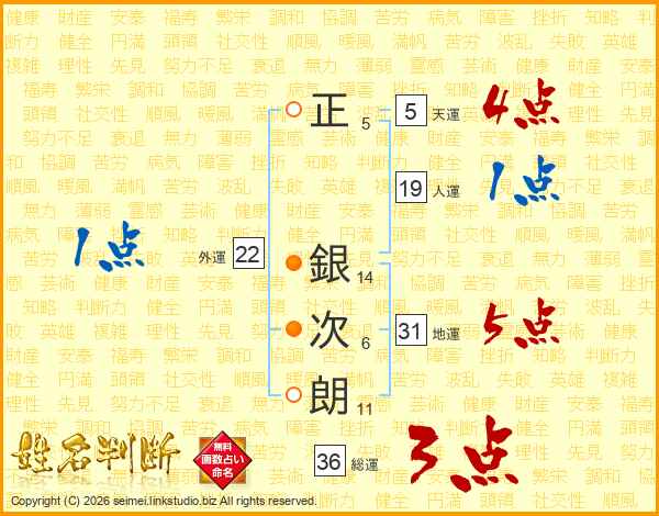 あなたの人生を表す1番重要な運勢です。生涯を通じて影響する総合運となり、主に50歳以降の晩年期に影響を及ぼします。苗字と名前の合計画数。