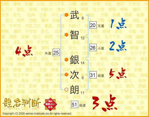 武(8画)智(12画) 銀(14画)次(6画)朗(11画)