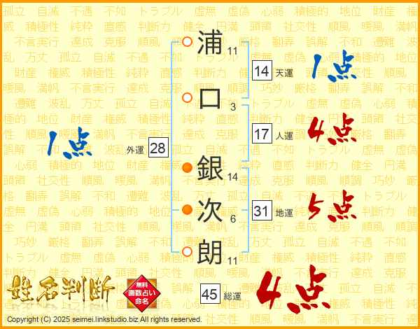 浦(11画)口(3画) 銀(14画)次(6画)朗(11画)