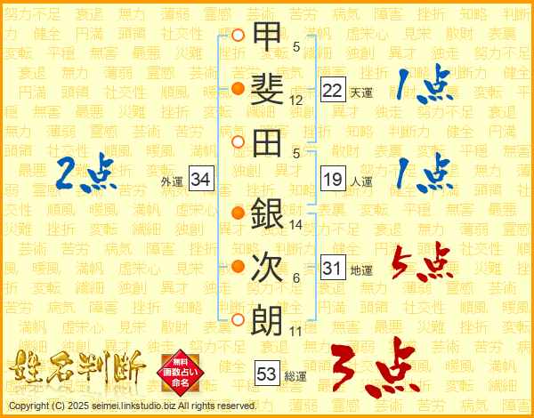 甲(5画)斐(12画)田(5画) 銀(14画)次(6画)朗(11画)