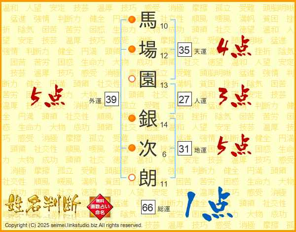 馬(10画)場(12画)園(13画) 銀(14画)次(6画)朗(11画)