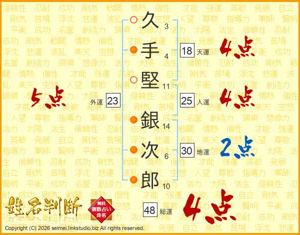 久(3画)手(4画)堅(11画) 銀(14画)次(6画)郎(10画)
