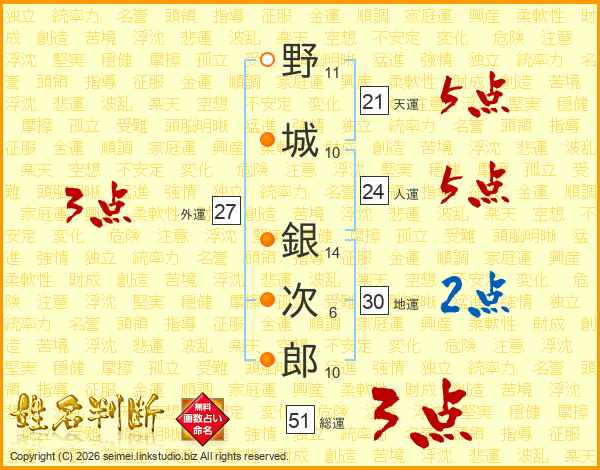 野城銀次郎さんの天運は21画の5点!