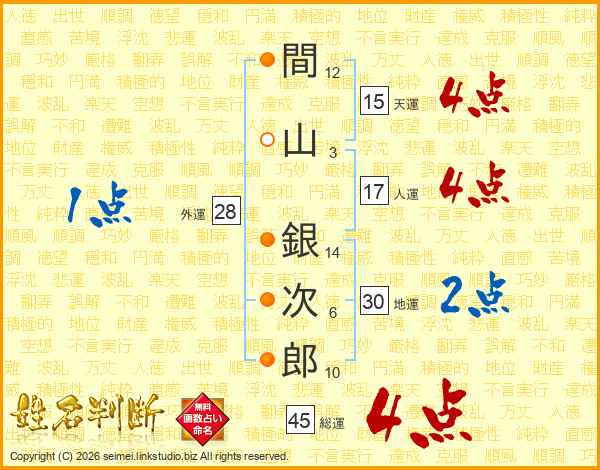 間(12画)山(3画) 銀(14画)次(6画)郎(10画)