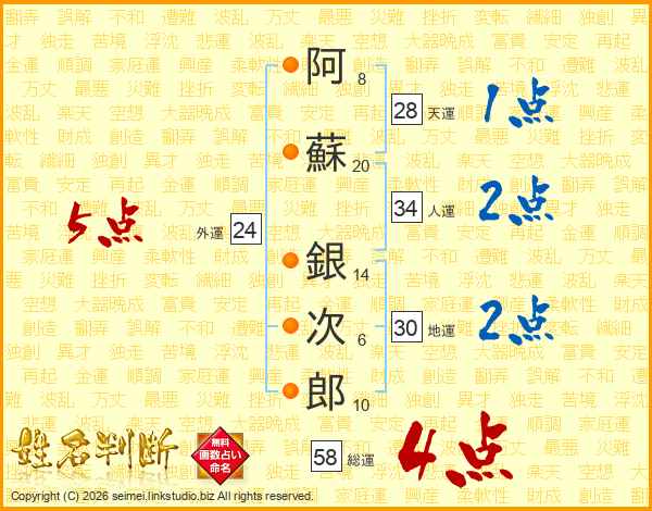 阿(8画)蘇(20画) 銀(14画)次(6画)郎(10画)