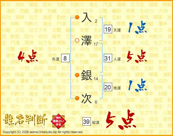 生活面を象徴する運勢です。外部から受ける影響力を表し、結婚運、家庭運や職場、環境への順応性を表します。総運から人運を引いた画数。姓や名が1文字の場合を除く。