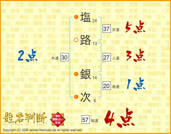 塩(24画)路(13画) 銀(14画)次(6画)