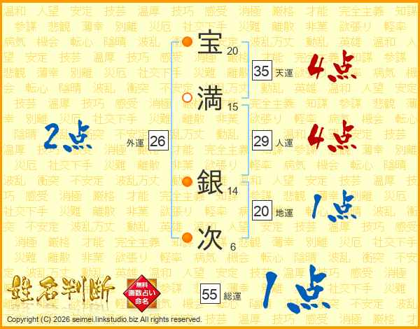 宝(20画)満(15画) 銀(14画)次(6画)