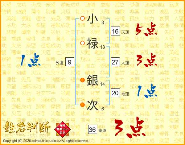 生活面を象徴する運勢です。外部から受ける影響力を表し、結婚運、家庭運や職場、環境への順応性を表します。総運から人運を引いた画数。姓や名が1文字の場合を除く。