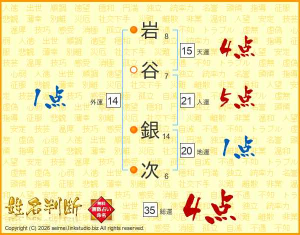 岩(8画)谷(7画) 銀(14画)次(6画)