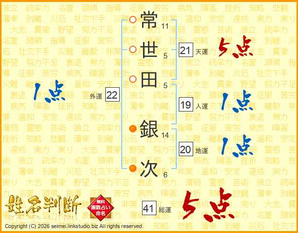 常(11画)世(5画)田(5画) 銀(14画)次(6画)