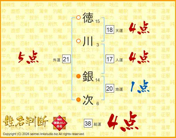 徳川銀次さんの総運は38画の4点!