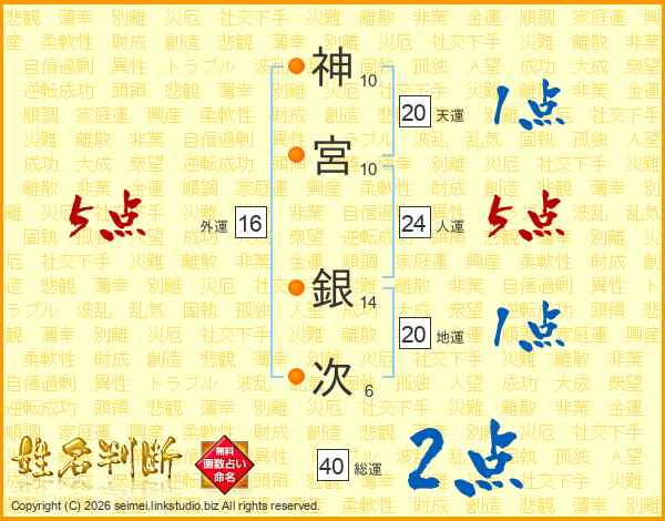 生活面を象徴する運勢です。外部から受ける影響力を表し、結婚運、家庭運や職場、環境への順応性を表します。総運から人運を引いた画数。姓や名が1文字の場合を除く。