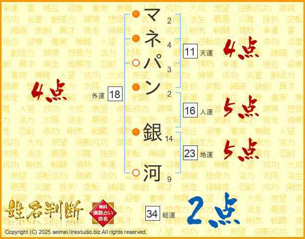 マ(2画)ネ(4画)パ(3画)ン(2画) 銀(14画)河(9画)