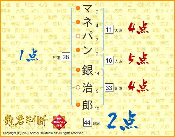 マ(2画)ネ(4画)パ(3画)ン(2画) 銀(14画)治(9画)郎(10画)