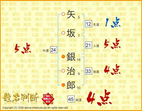 矢(5画)坂(7画) 銀(14画)治(9画)郎(10画)