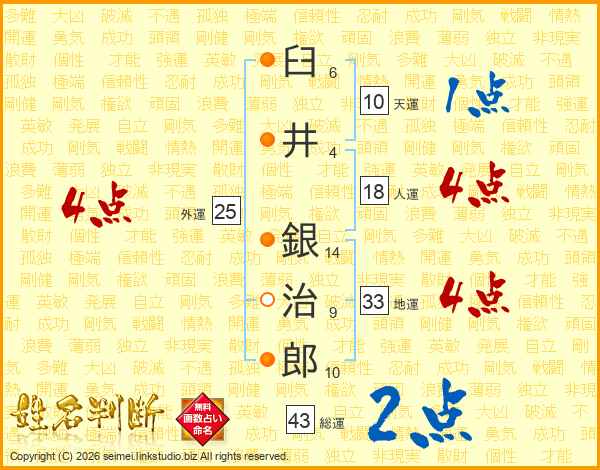 臼(6画)井(4画) 銀(14画)治(9画)郎(10画)
