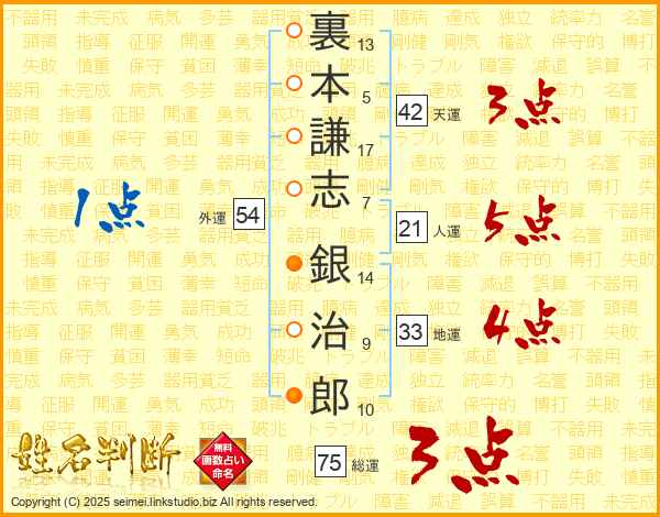 裏(13画)本(5画)謙(17画)志(7画) 銀(14画)治(9画)郎(10画)