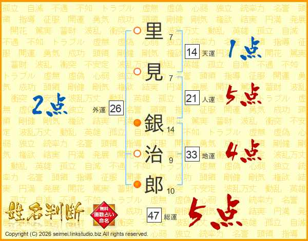 里(7画)見(7画) 銀(14画)治(9画)郎(10画)