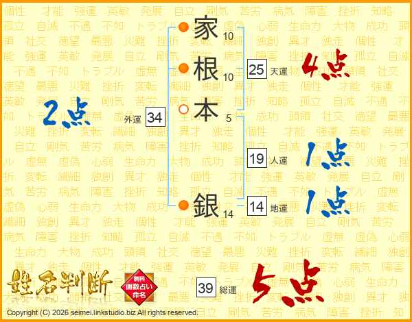 家系が持つ宿命的な運勢を表します。祖先から受け継いだ苗字ですので自分の力が及びません。家柄を象徴します。苗字の合計画数。