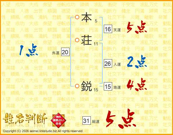 本荘鋭さんの総運は31画の5点!