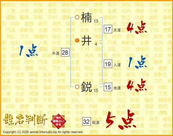 生活面を象徴する運勢です。外部から受ける影響力を表し、結婚運、家庭運や職場、環境への順応性を表します。総運から人運を引いた画数。姓や名が1文字の場合を除く。
