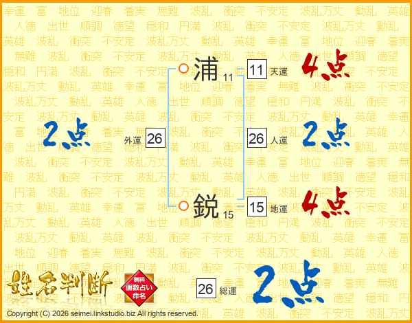 生活面を象徴する運勢です。外部から受ける影響力を表し、結婚運、家庭運や職場、環境への順応性を表します。総運から人運を引いた画数。姓や名が1文字の場合を除く。