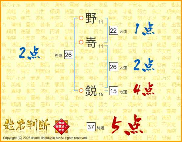 野嵜鋭さんの総運は37画の5点!