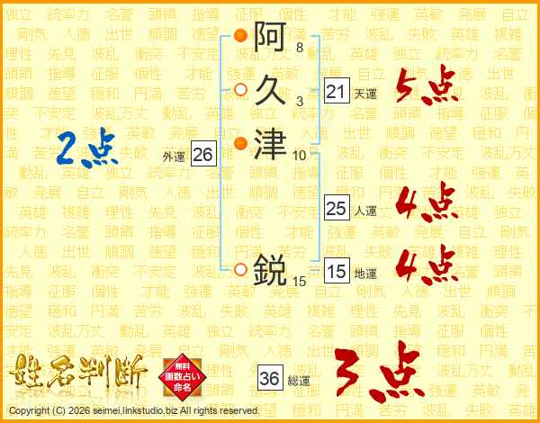 阿(8画)久(3画)津(10画) 鋭(15画)