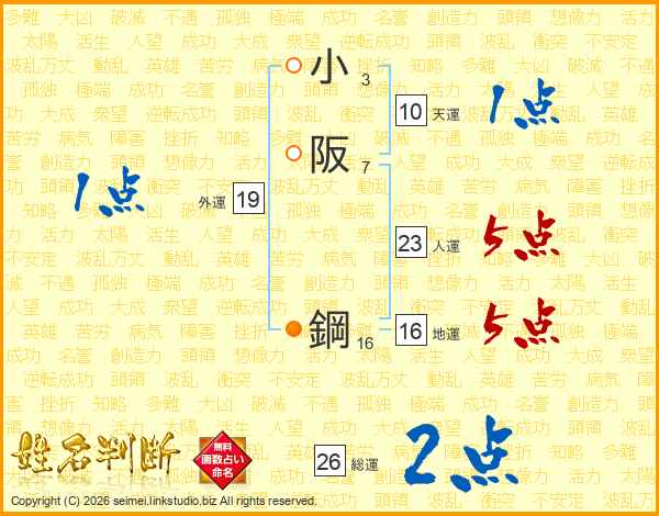 小阪鋼さんの総運は26画の2点!