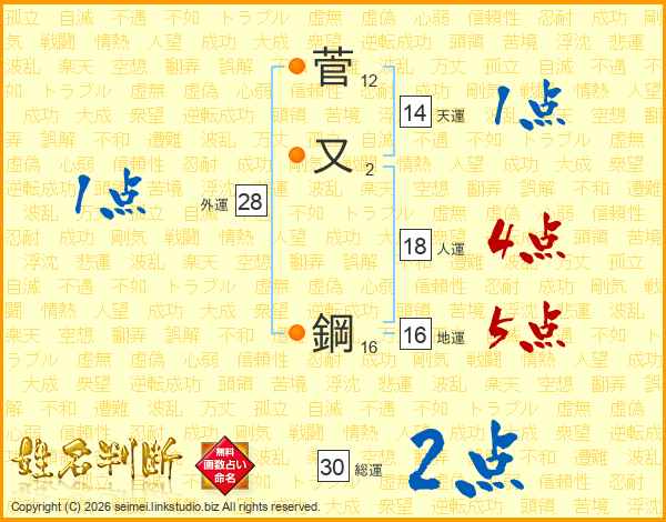 あなたの人生を表す1番重要な運勢です。生涯を通じて影響する総合運となり、主に50歳以降の晩年期に影響を及ぼします。苗字と名前の合計画数。