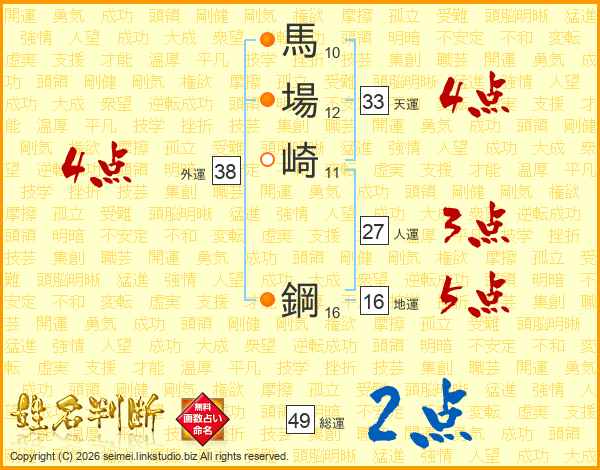 馬(10画)場(12画)崎(11画) 鋼(16画)