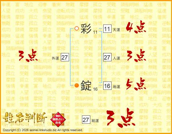 あなたの人生を表す1番重要な運勢です。生涯を通じて影響する総合運となり、主に50歳以降の晩年期に影響を及ぼします。苗字と名前の合計画数。