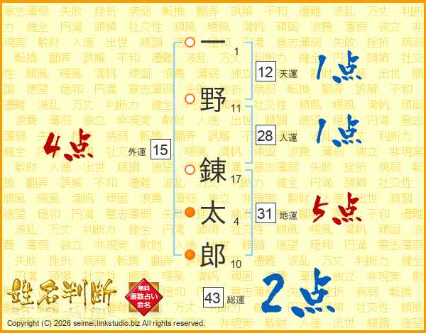一(1画)野(11画) 錬(17画)太(4画)郎(10画)