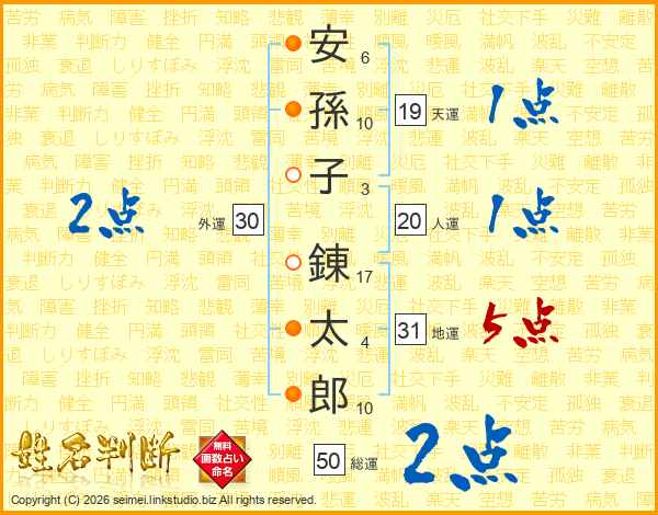 安(6画)孫(10画)子(3画) 錬(17画)太(4画)郎(10画)