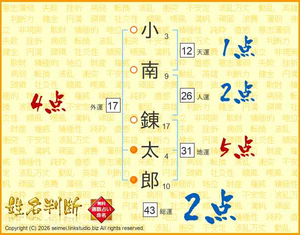 小(3画)南(9画) 錬(17画)太(4画)郎(10画)