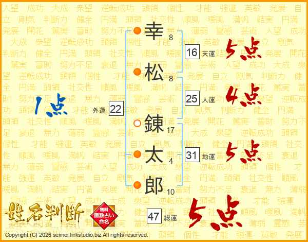幸(8画)松(8画) 錬(17画)太(4画)郎(10画)