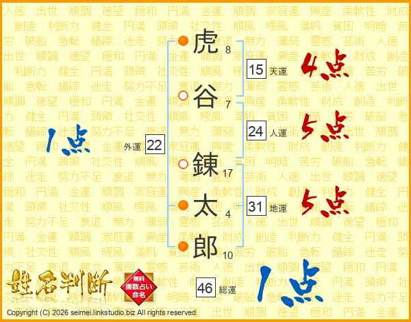 虎(8画)谷(7画) 錬(17画)太(4画)郎(10画)