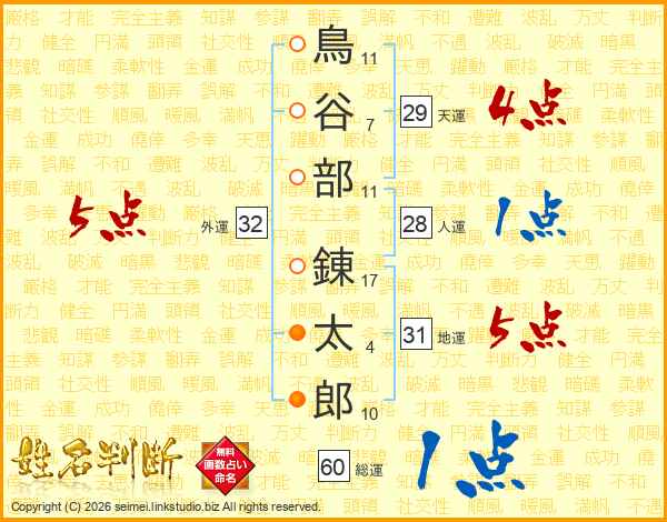鳥谷部錬太郎さんの外運は32画の5点!