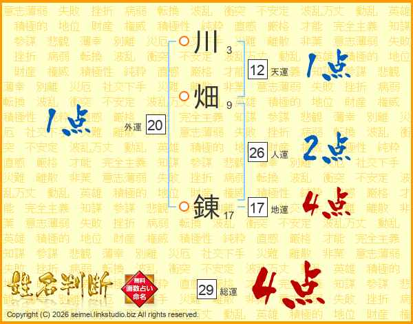 生活面を象徴する運勢です。外部から受ける影響力を表し、結婚運、家庭運や職場、環境への順応性を表します。総運から人運を引いた画数。姓や名が1文字の場合を除く。