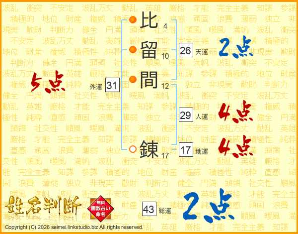 比留間錬さんの総運は43画の2点!