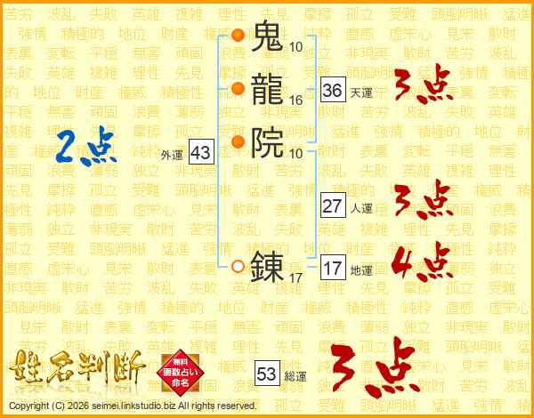 鬼(10画)龍(16画)院(10画) 錬(17画)