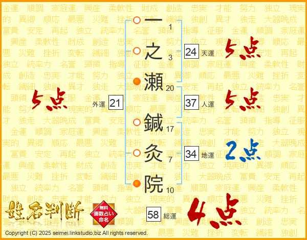 一(1画)之(3画)瀬(20画) 鍼(17画)灸(7画)院(10画)