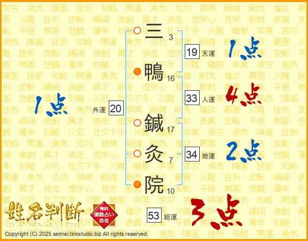 三(3画)鴨(16画) 鍼(17画)灸(7画)院(10画)