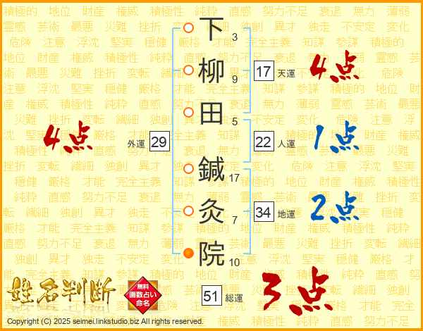 下(3画)柳(9画)田(5画) 鍼(17画)灸(7画)院(10画)