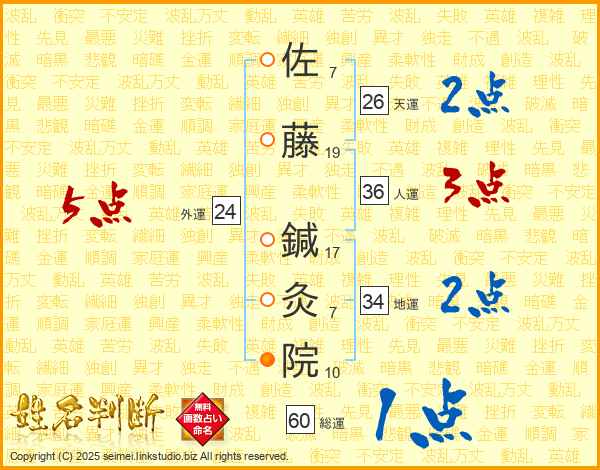 佐(7画)藤(19画) 鍼(17画)灸(7画)院(10画)