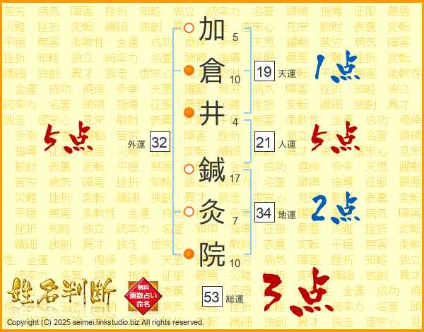 生活面を象徴する運勢です。外部から受ける影響力を表し、結婚運、家庭運や職場、環境への順応性を表します。総運から人運を引いた画数。姓や名が1文字の場合を除く。
