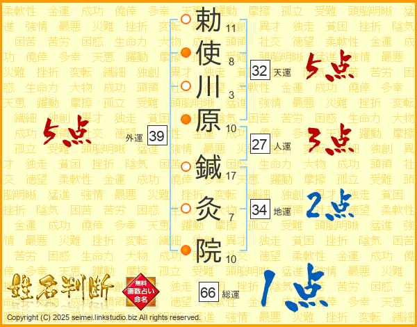 勅(11画)使(8画)川(3画)原(10画) 鍼(17画)灸(7画)院(10画)