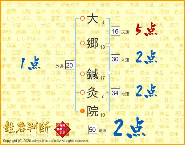 大(3画)郷(13画) 鍼(17画)灸(7画)院(10画)